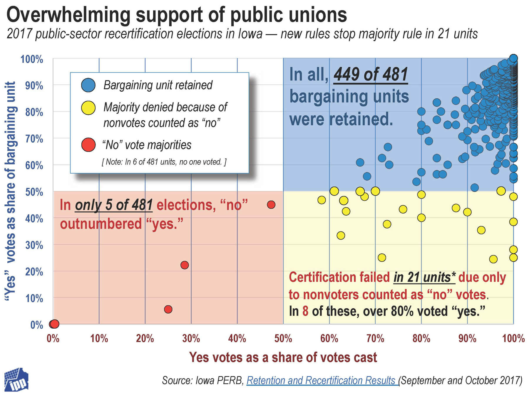 Consider some of the numbers from the September and October elections (summarized in the graphic below). Of those voting, almost 98% vote to keep the union. Of the 481 bargaining units up for recertification, 449 were retained; in 67 of these, every member of the bargaining unit cast a yes vote; in 349 of them, over 80 percent of the bargaining unit voted yes. That cluster of blue dots in the upper right quadrant of the graphic? That’s solidarity. Of the 32 bargaining units (accounting for about 1,000 workers) decertified, only 5 lost the majority of votes cast; in the other 27, nonvoters—counted as “no” under the new rules–made the difference.