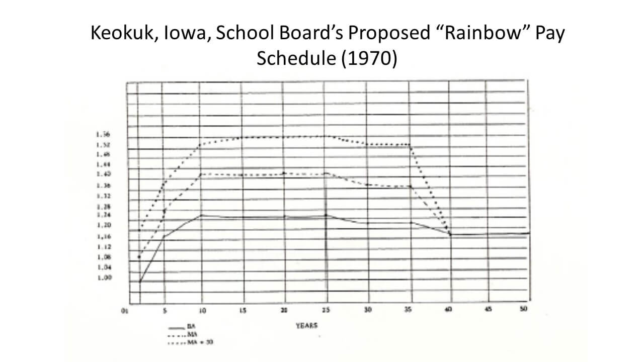 The centerpiece of Leland’s plan was what the teachers came to describe as the “Rainbow” pay schedule. Whereas the existing schedule provided for pay grades corresponding to levels of education and seniority with some additional “merit” pay, the Rainbow schedule proposed to reverse this emphasis: between years two and five of employment, teacher pay increased each year along tracks corresponding to education level. Between years ten and twenty-five, however, all pay increases came from merit pay at the discretion of administrators. Between years twenty-five and forty, teacher pay would gradually decrease for all education levels, eventually compressing into a single, static pay scale after year forty. Leland was open about the schedule’s purpose—to reduce overall costs, in part by incentivizing early retirement.