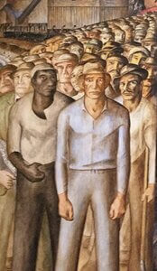 There was a major controversy when Clifford Wight put a hammer-and-sickle on a wall over a window. Wight claimed that he was just showing what is in the American scene today. The American scene was what the artists were all supposed to be depicting. Well, that didn’t wash. Once someone in authority spotted what Wight had done, the image was eliminated. John Langley Howard’s mural, California Industrial Scenes, has the most direct depictions of the Great Depression. He has unemployed in the center. On the left side, there’s a group of May Day marchers. One is holding a copy of The Western Worker, the newspaper of the Communist Party. The headline says, “March against hunger, war, and fascism.” The Western Worker banner, with a hammer-and-sickle in the middle, was painted over. This was clearly an act of political censorship.