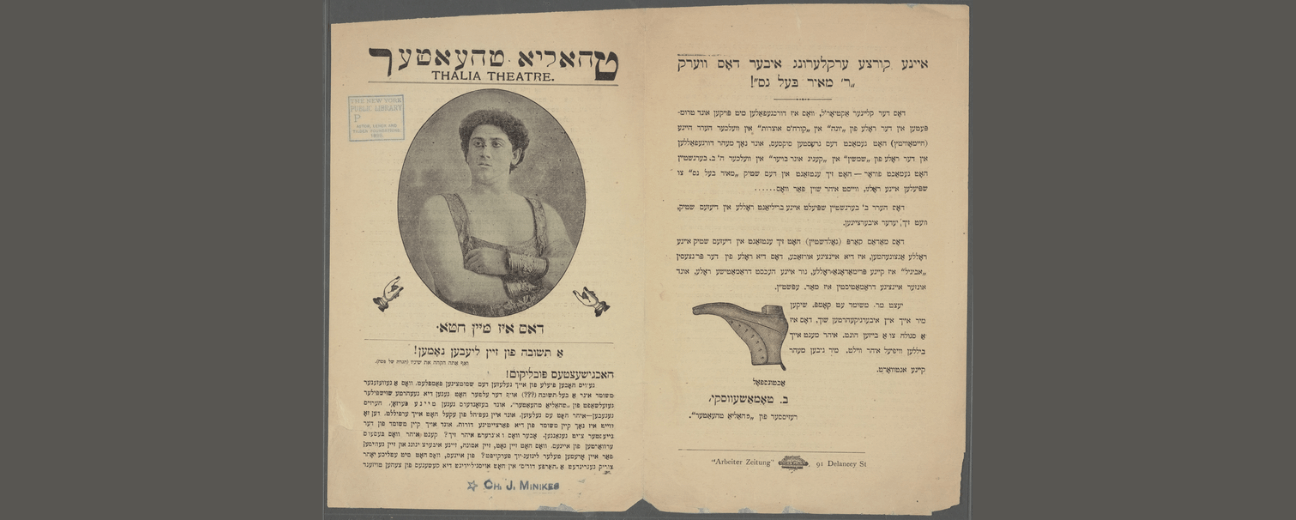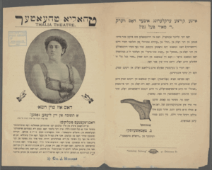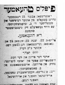 “GEHT NIT IN PIPELS THEATER! (Don’t go to the People’s Theatre!) A lookout at the People’s Theatre! Saturday night the bosses of the People’s Theatre locked out the following members of the Hebrew Actors’ Protective Union: … Workers and friends, we implore you not to go to the People’s Theatre until we achieve our demands… Thomashefsky should perform before empty walls as long as our just demands are not granted as commanded by the organized workers” (Hibru Eḳṭers Proteḳṭiṿ Yunyon 1899).