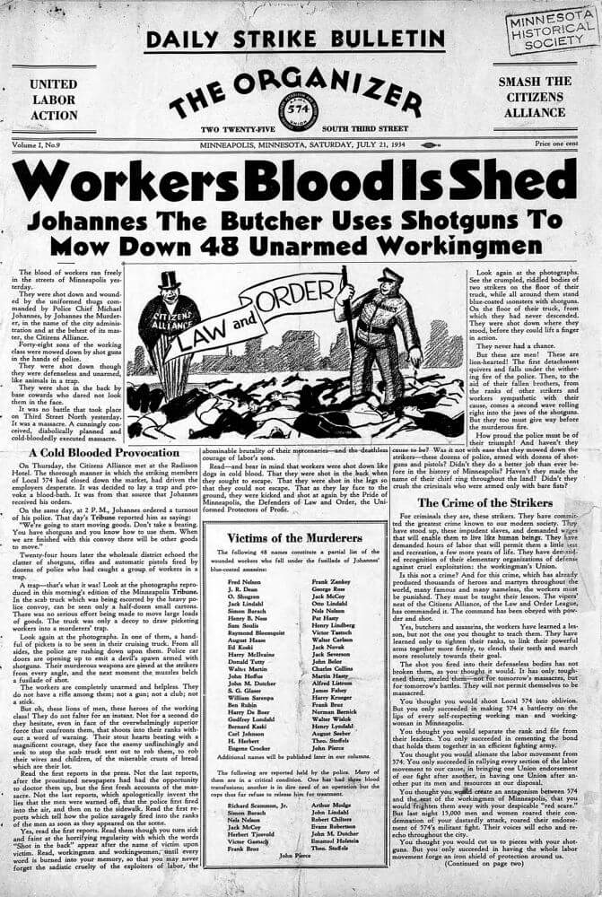 The Minneapolis mass strikes of 1934 may look like a distant event from a bygone era of labor insurgency, only connected to the present through a shared history of geography. But the mass strikes also resonate through police violence against workers, community organizing tactics and the power of solidarity. Emerging out of the depths of the Great Depression, the mass strikes revealed a profound reality: organized working people can win, even against the combined forces of employers, police terror, capitalist vigilante groups, conservative union leadership, mainstream media, and fickle liberal politicians. Indeed, the mass strikes broke the citadel of the “open shop”—upheld by the powerful Citizens’ Alliance—and turned Minneapolis into a union town.